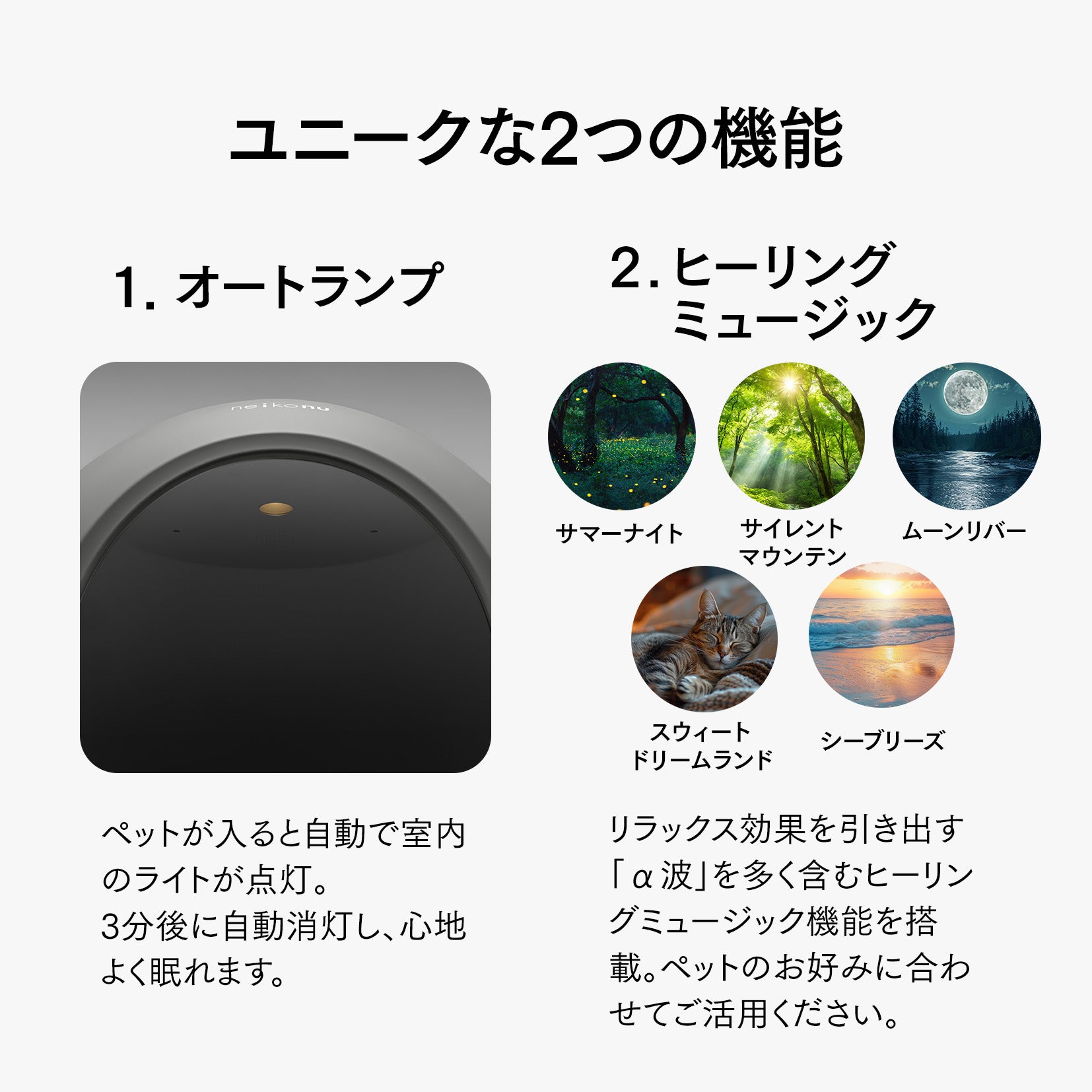 【ルームランプを搭載】ペットがくつろげるよう、5種類の音が流れる音楽機能を搭載。ゆっくり落ち着いて休める空間を演出します。