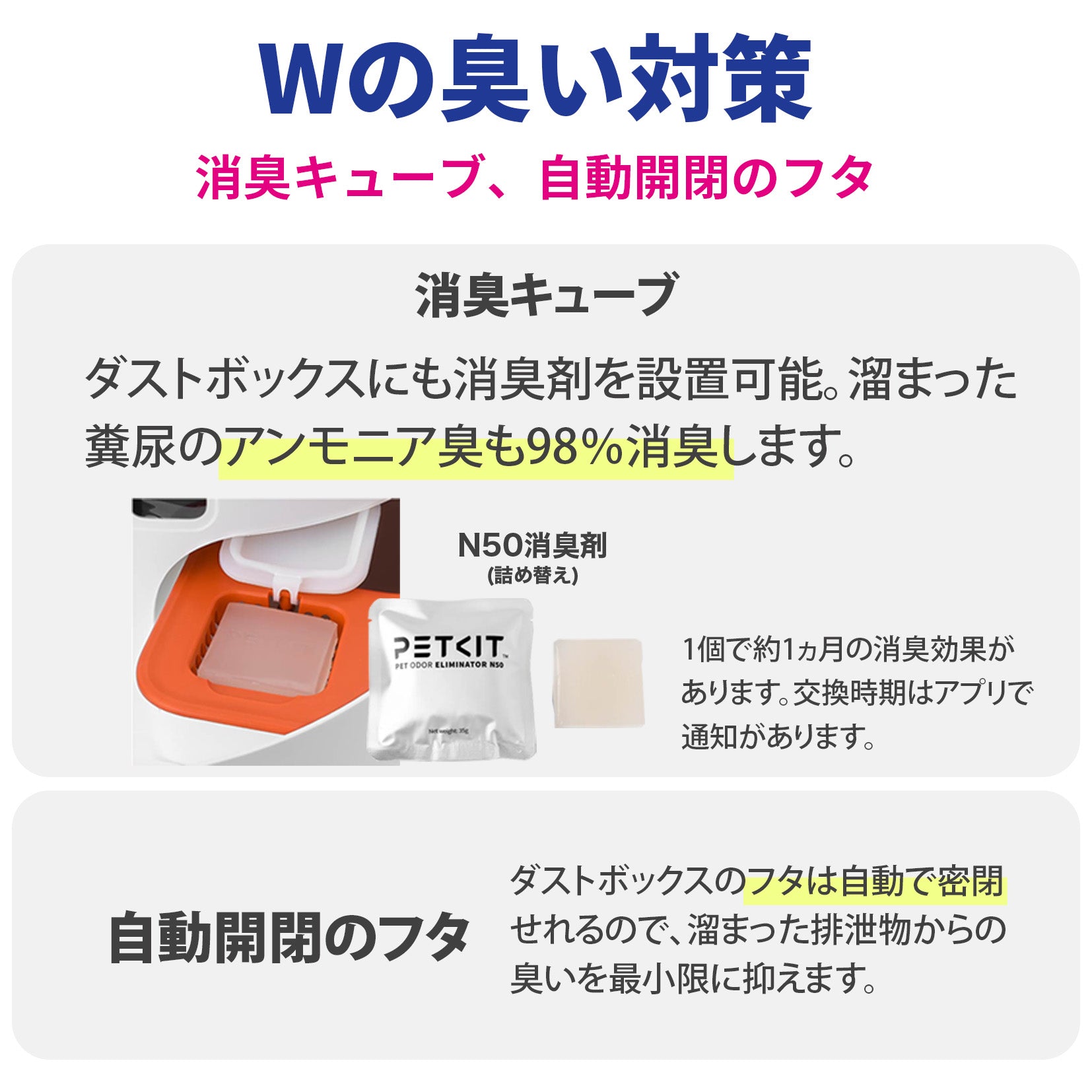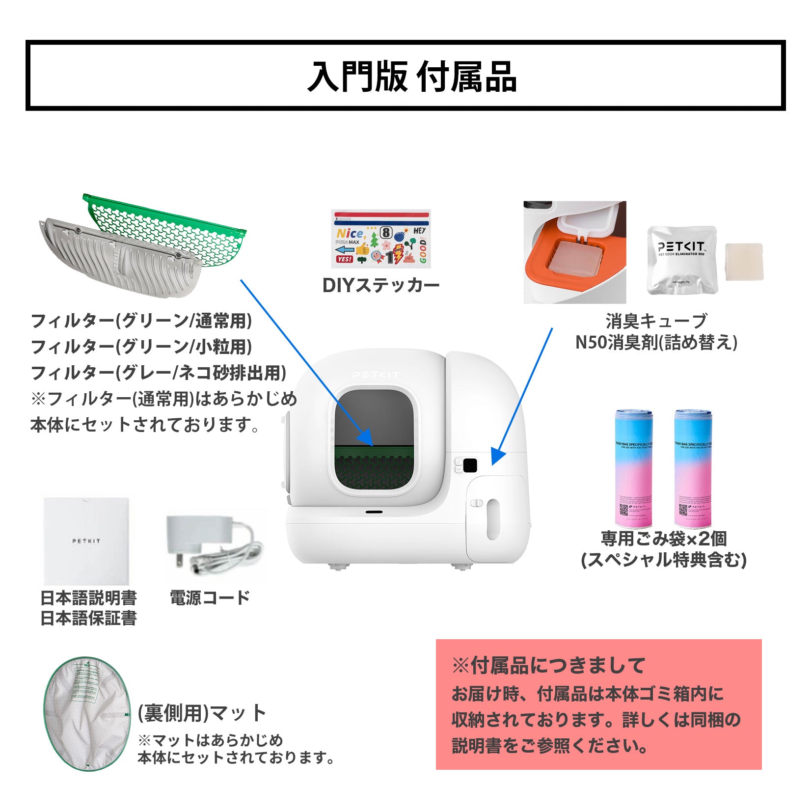 | パッケージリスト | 本体、フィルター(グリーン)、フィルター(グレー)、マット(裏側用)、N50消臭剤、専用ゴミ袋×2(特典含む)、取り扱い説明書、電源コード、DIYステッカー |