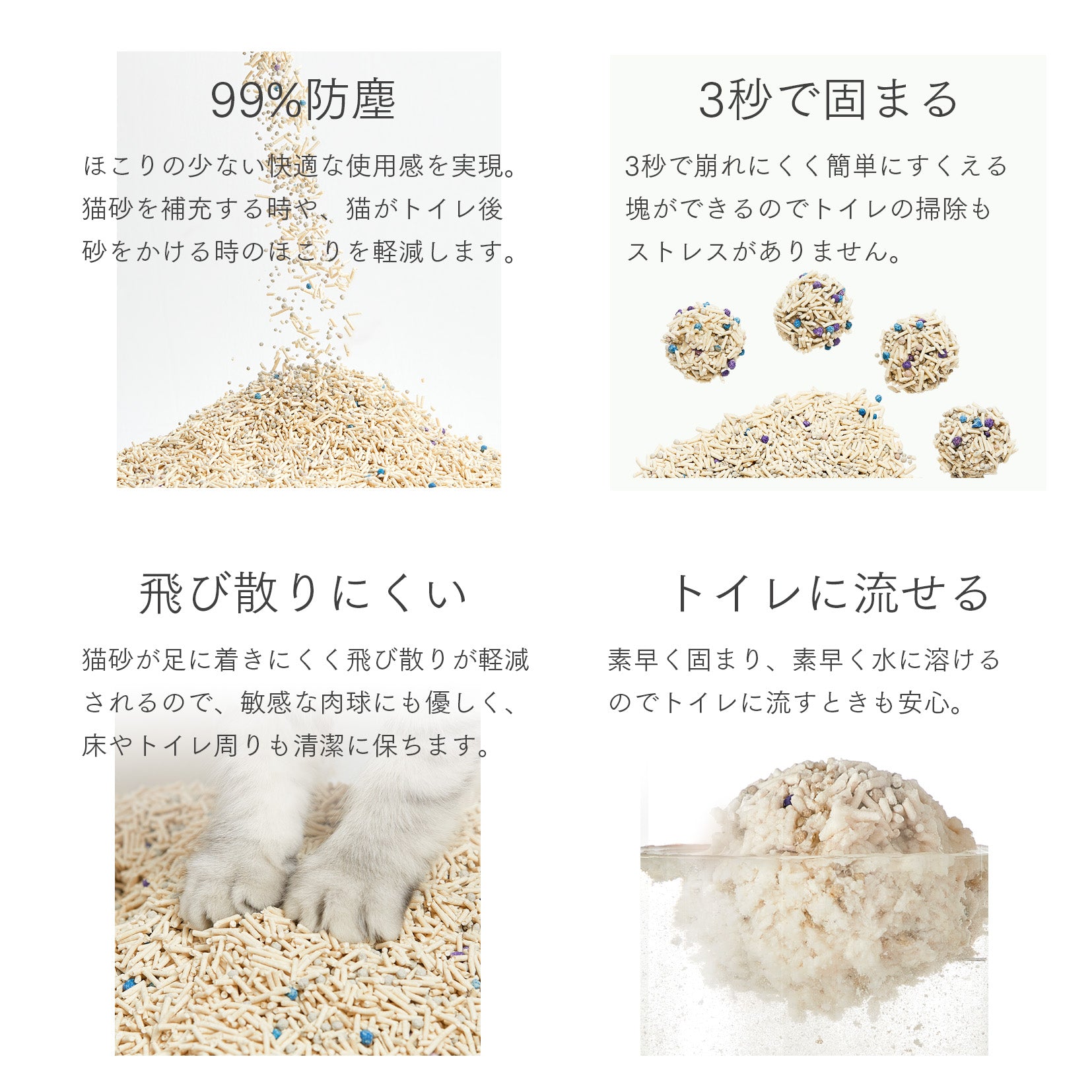 | 製品特徴 | PETKITの自動猫トイレのフィルター粒径を最適化 98.5%の猫砂節約 3秒で素早く固まり形成 しっかりとした塊で崩れにくく、すくいやすい 優れた消臭効果 99%防塵 飛び散りにくい トイレに流せる |